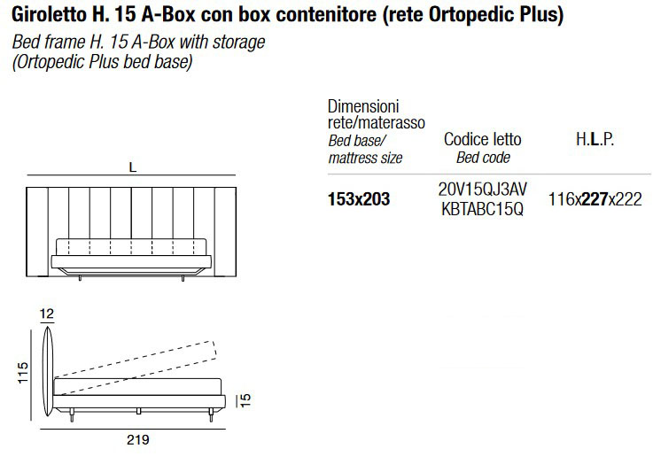 • Marco de cama H. 15 A-Box con caja de almacenamiento (base Orthopedic Plus) - 153 x 203 cm