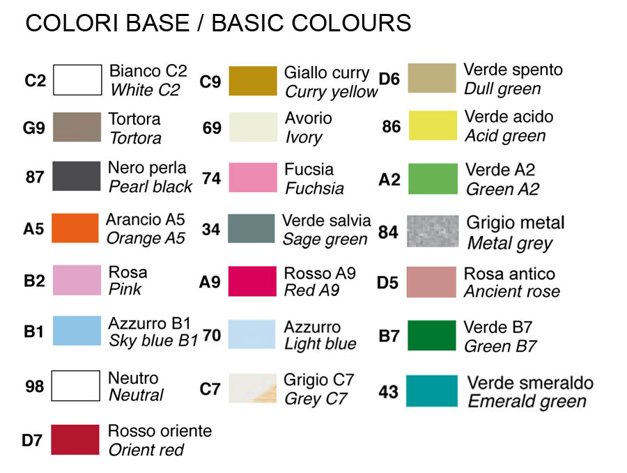 Associazione Nome-Colore: i nomi dei colori potrebbero non corrispondere realmente al colore del campione. Pertanto, vi invitiamo a basarvi maggiormente sulla colorazione dell'immagine e non esclusivamente sui nomi. Per info e suggerimenti, siamo a vostra disposizione.