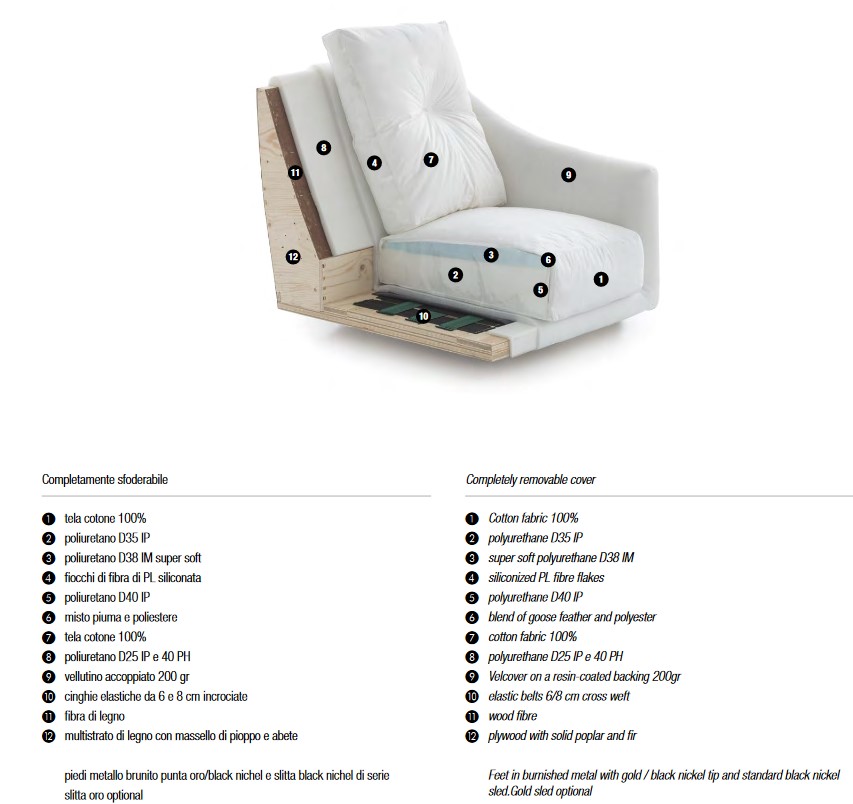 Patas de metal bruñido con puntas en oro/black níquel y trineo black níquel de serie. Trineo dorado disponible bajo pedido.